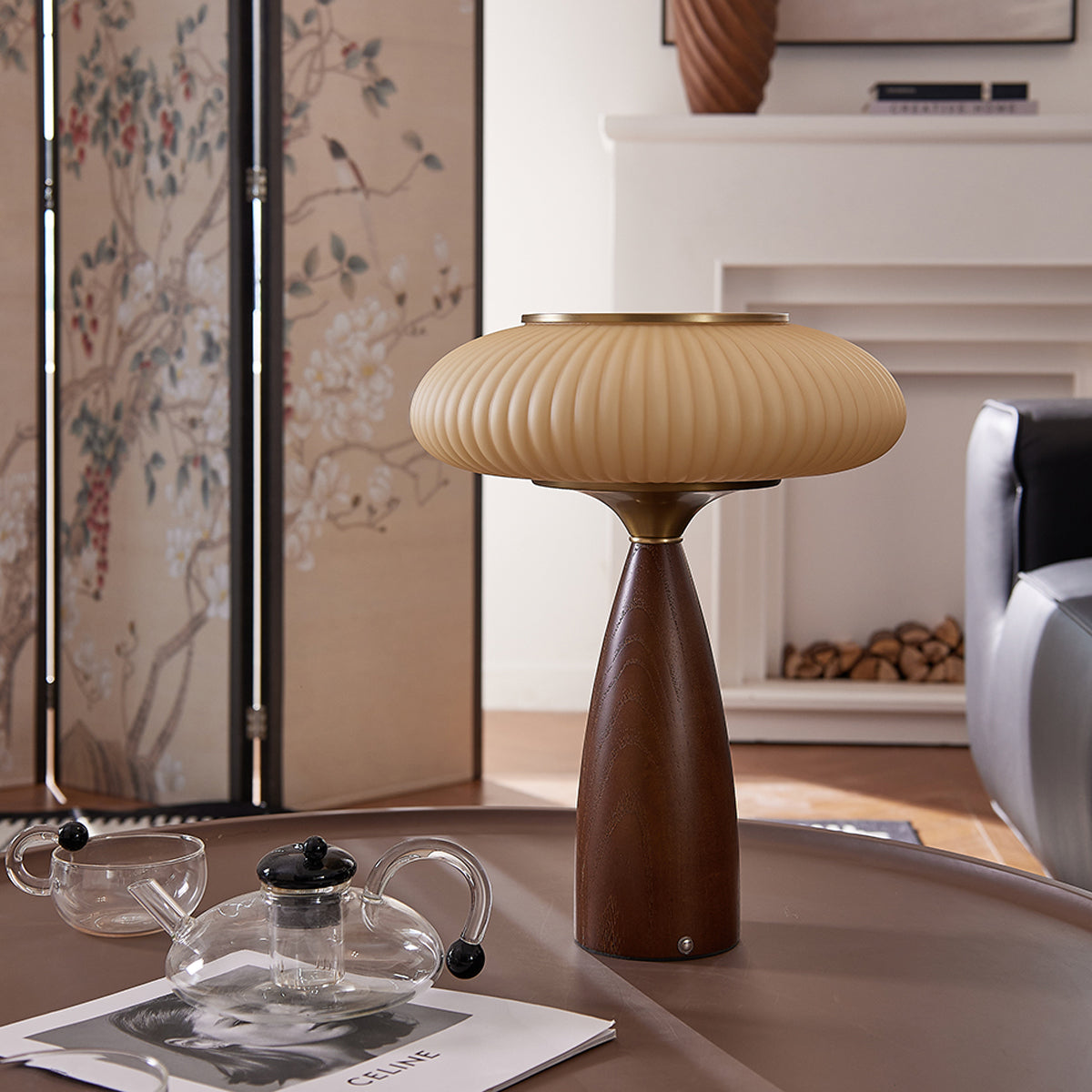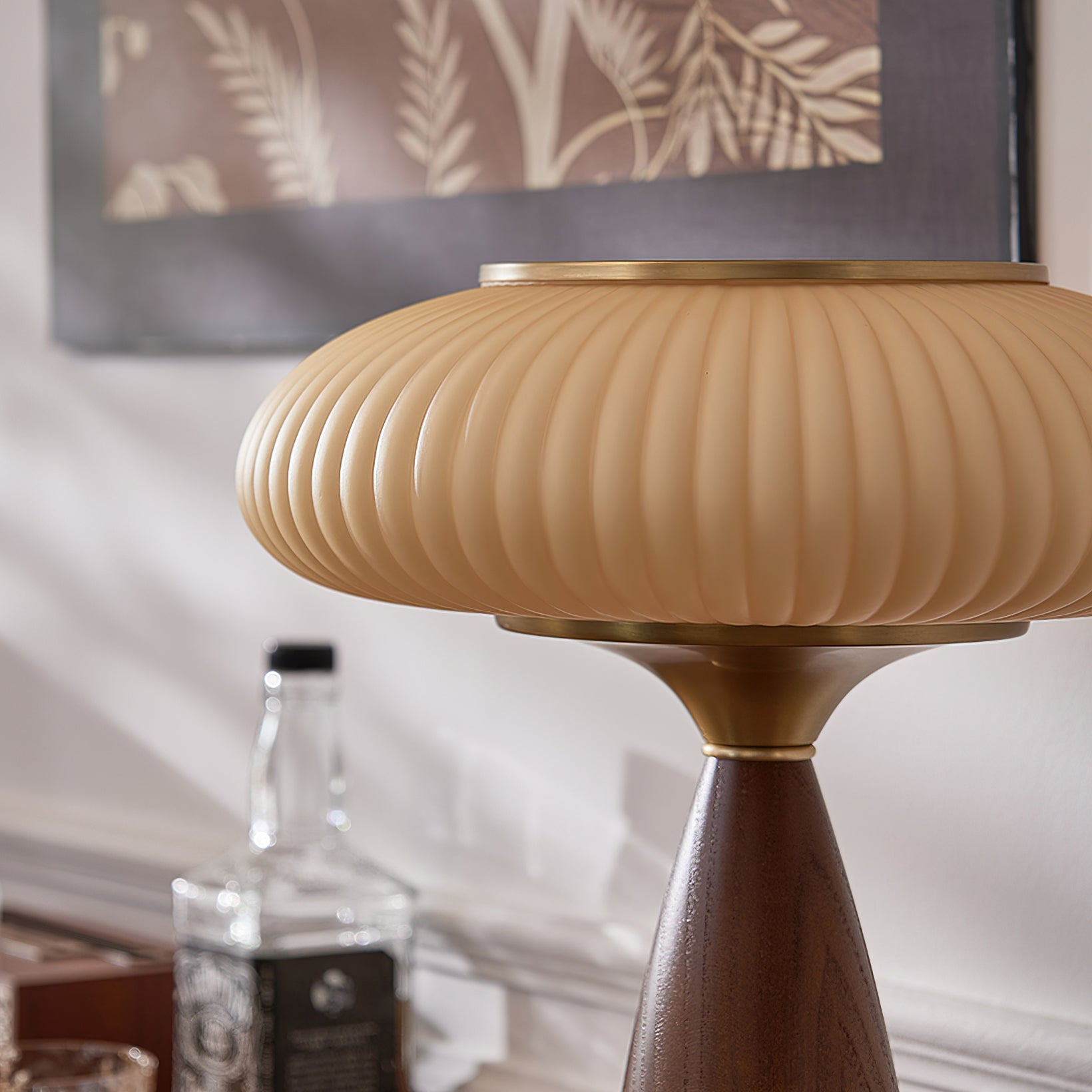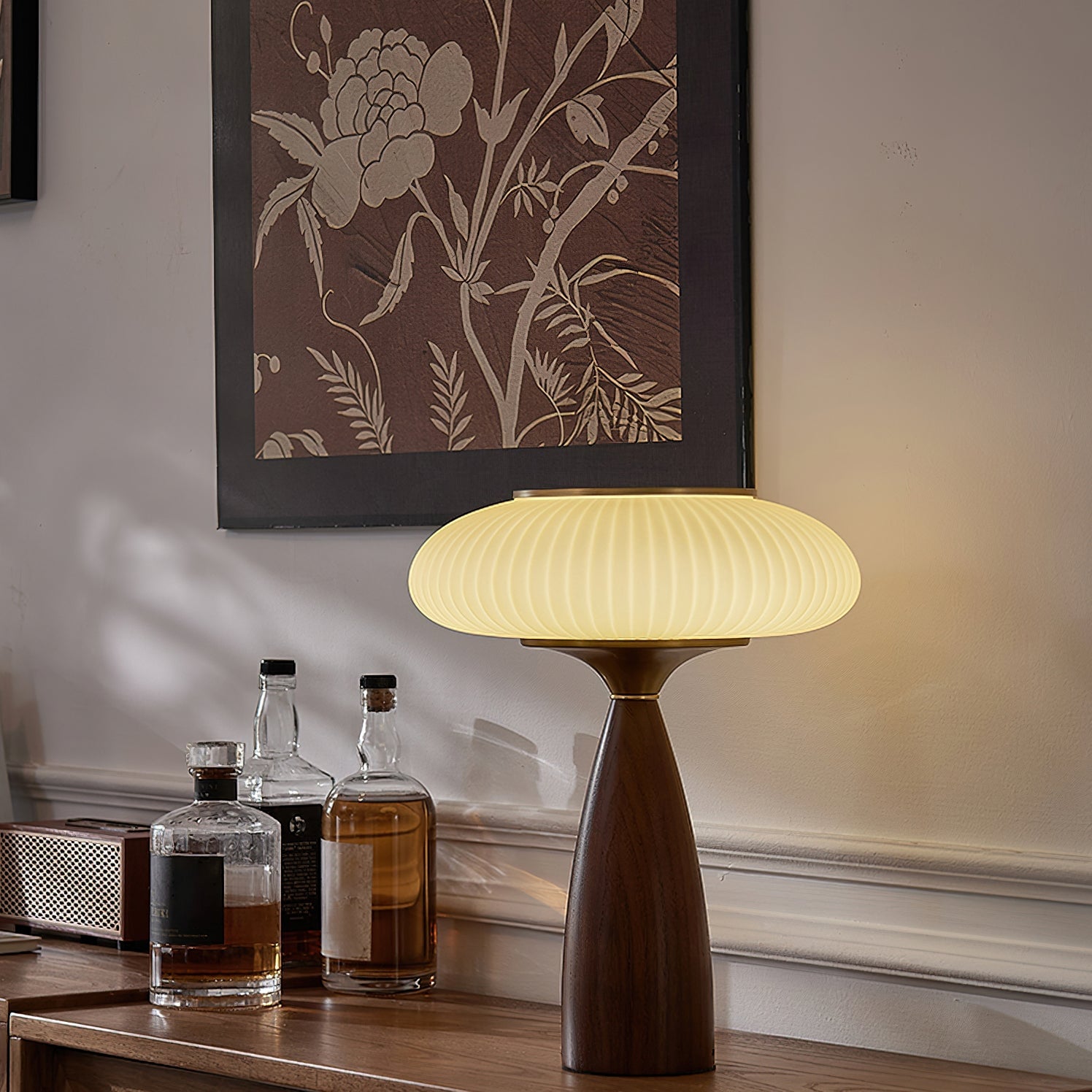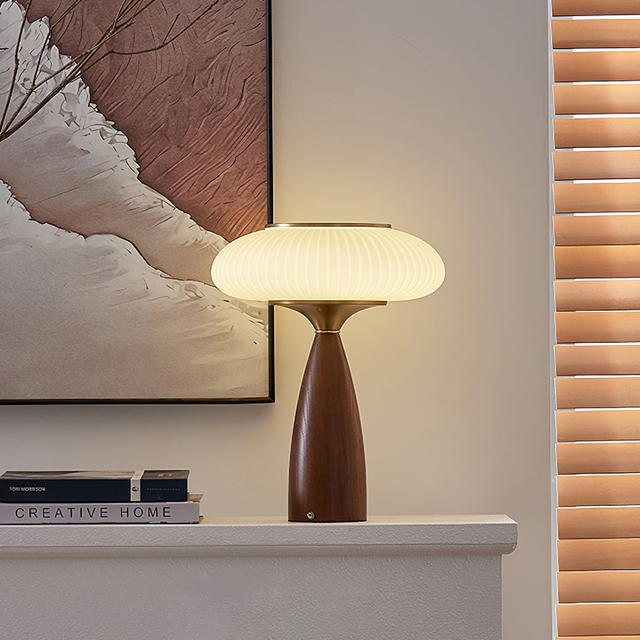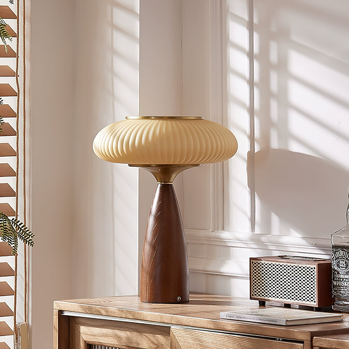 Introduce vintage charm into your space with the Welma Table Lamp from Mooijane. The pleated glass shade offers a cozy, diffused light, ideal for reading or relaxing. With a rich, grained wood and elegant gold detailing, this lamp adds a stylish touch to any room. Perfectly combining function with style, the Welma Table Lamp is a must-have for any modern space.