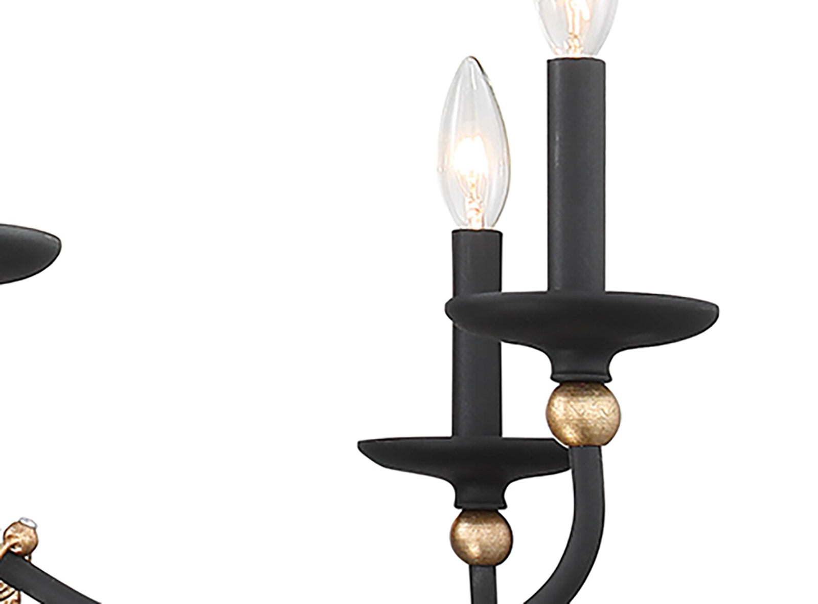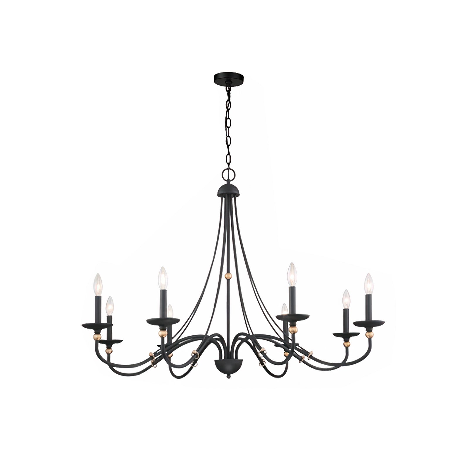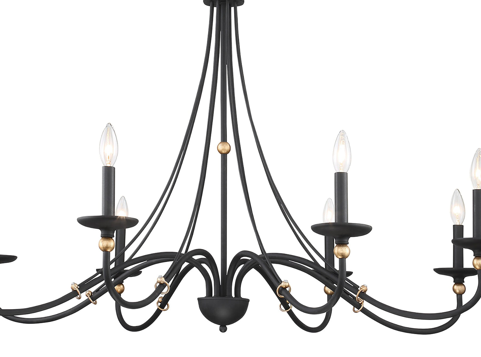 Enhance your space with the elegant design of this eight-light chandelier from the Westchester County collection. The smooth, curved arms are coated in a rich sand black finish, complemented by gleaming gold accents that add a luxurious touch. The candle-style lights, complete with matching cups and covers, create a refined, yet minimalist aesthetic. This chandelier is the perfect blend of traditional charm and modern sophistication, making it a stunning centerpiece for any room.