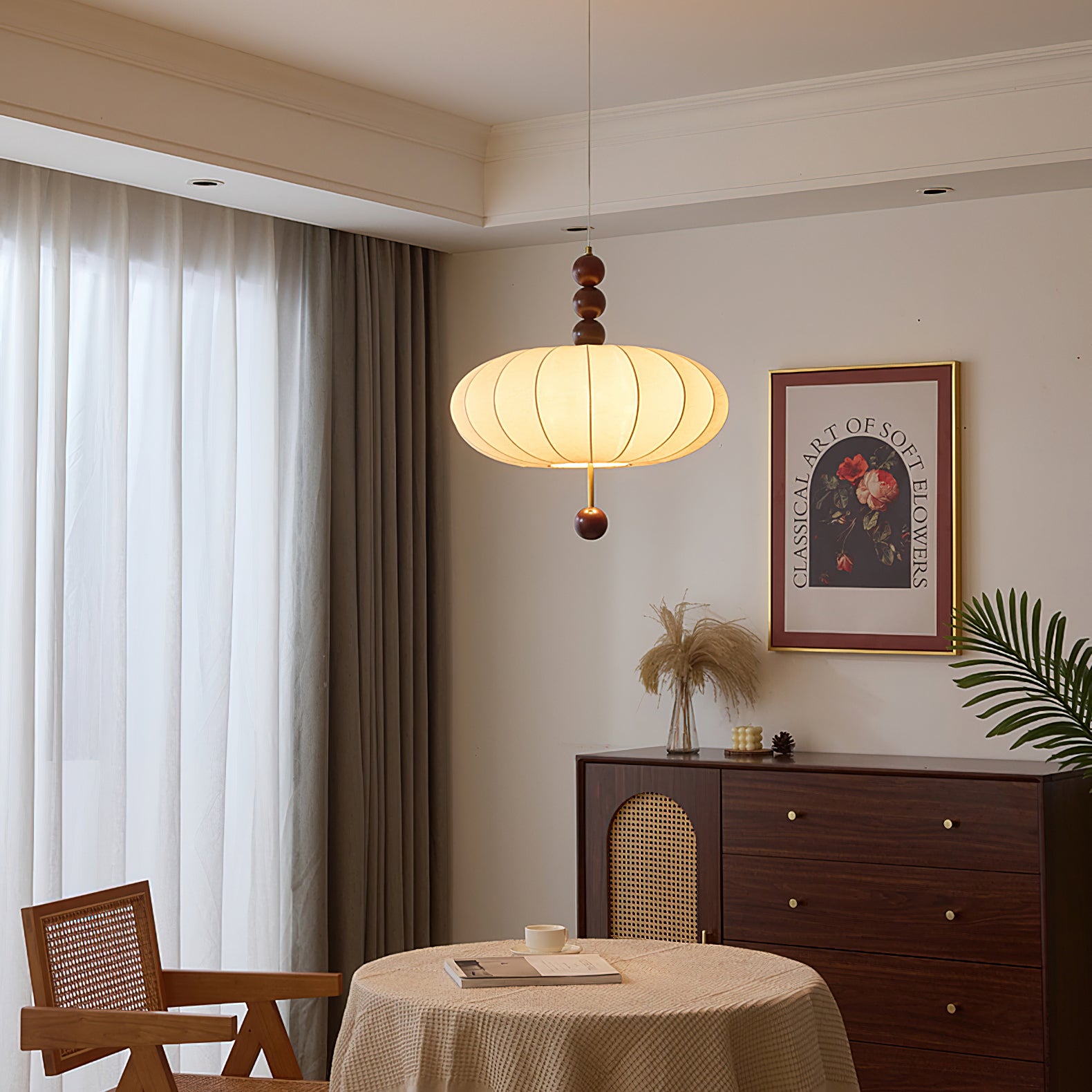 The Winnie Veil Pendant Light by Mooijane is a beautiful blend of fabric and wood accents, bringing a touch of elegance to any space. With a soft and diffused glow, this pendant light adds a serene and vintage-inspired touch to modern interiors. Elevate your space with a timeless piece from Mooijane.