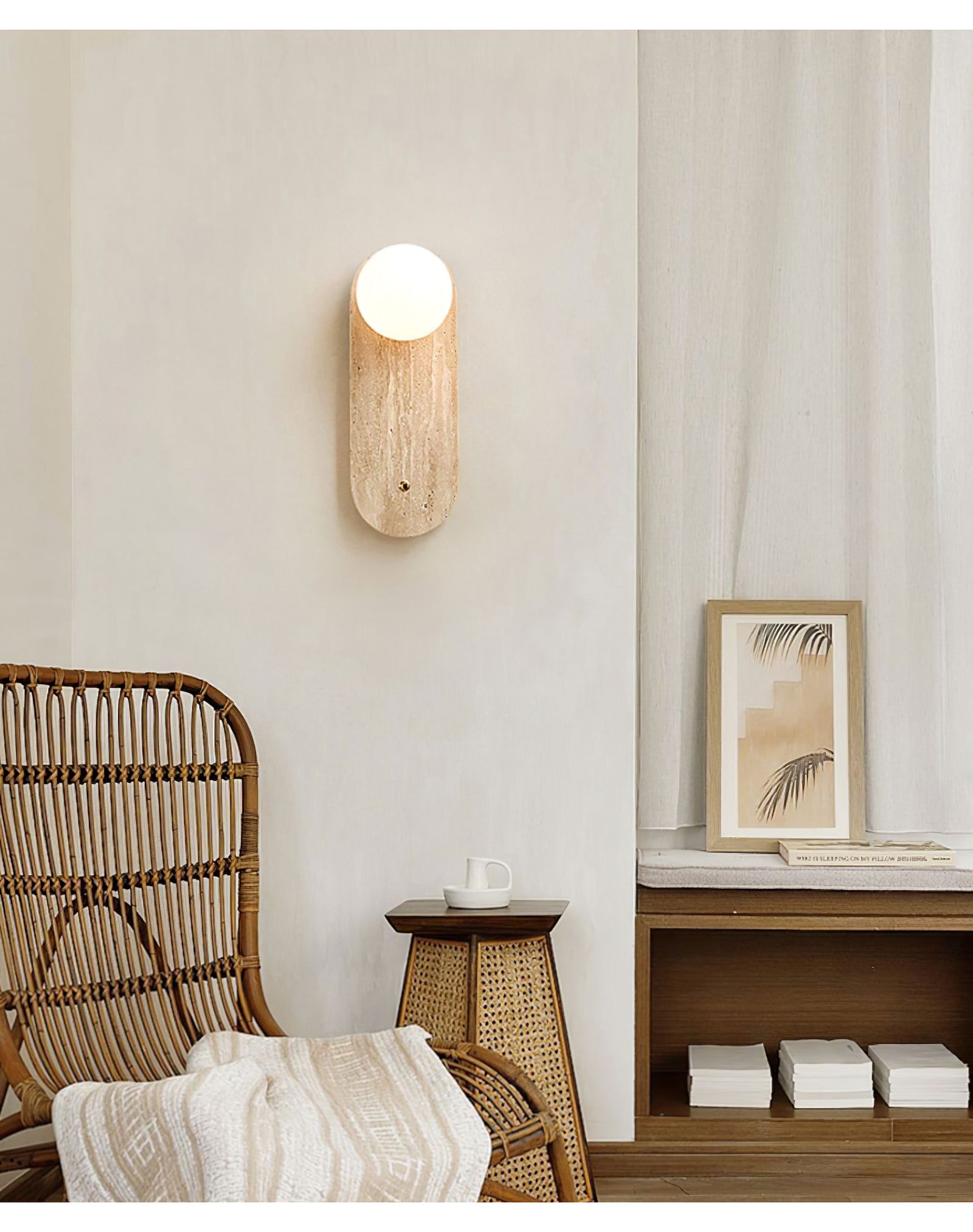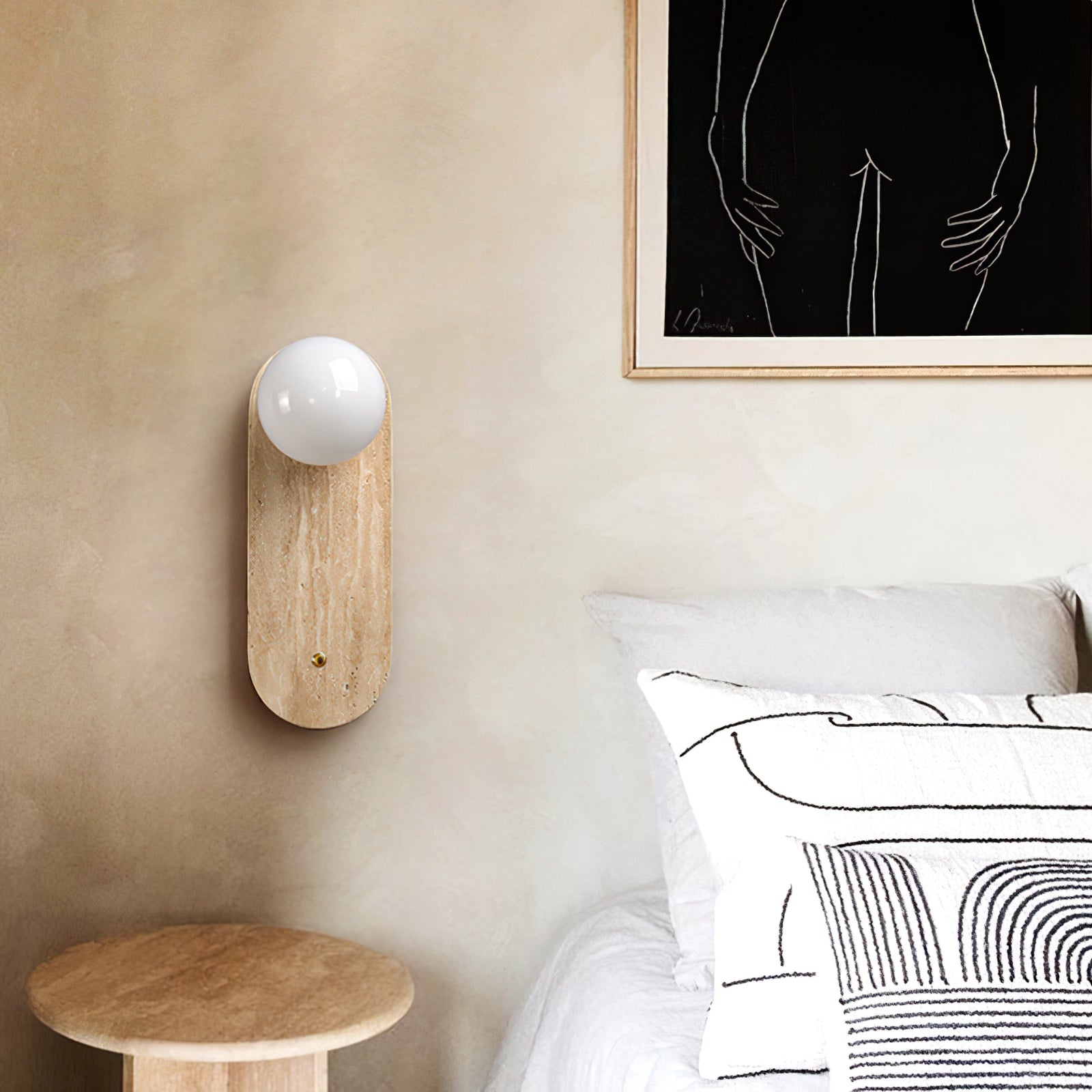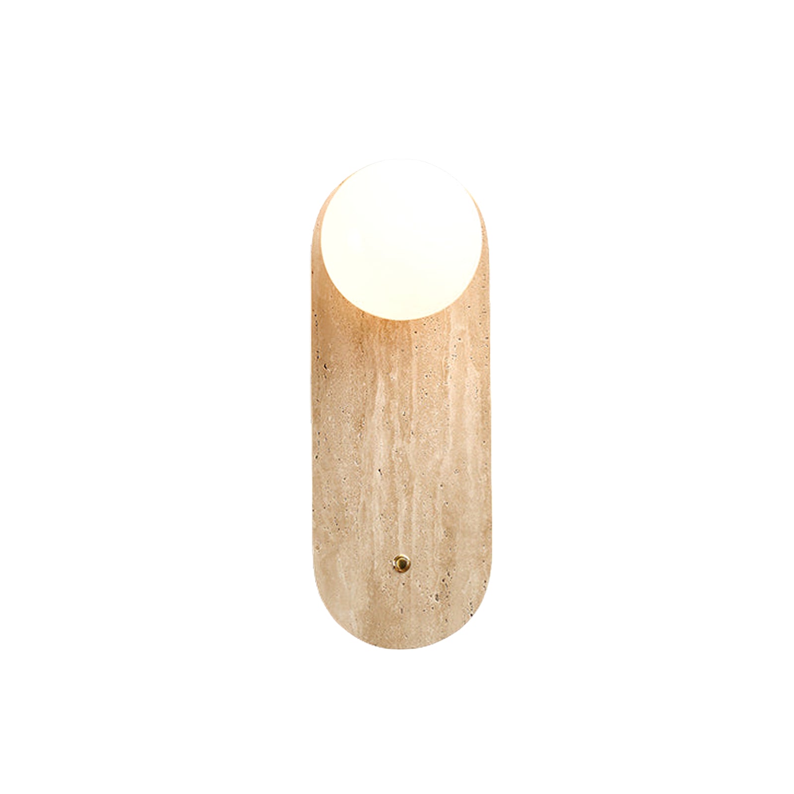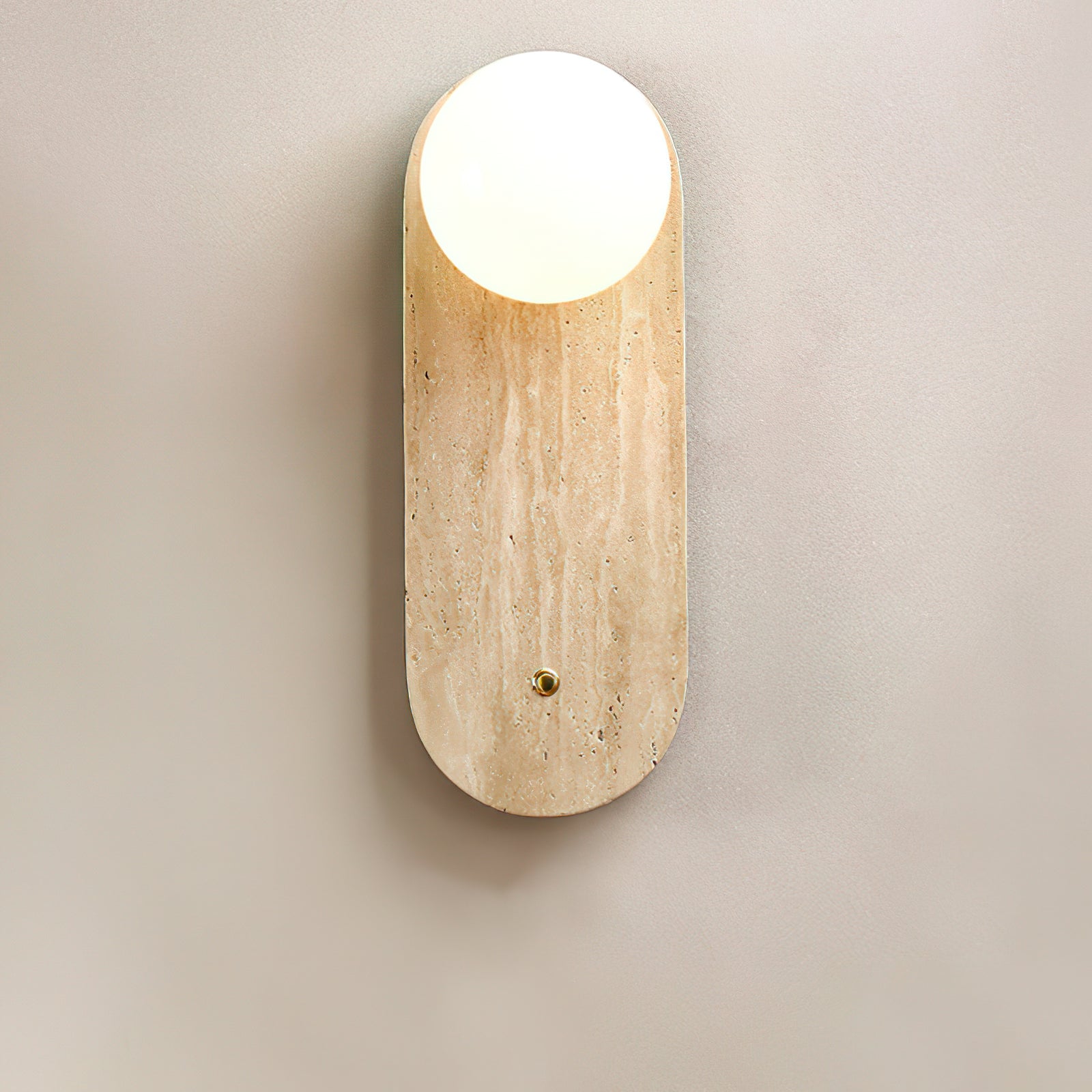 The Yellow Oval Travertine Wall Sconce combines natural elegance with minimalist design, making it a sophisticated addition to any space. Crafted from warm-toned travertine, the oval base showcases the stone’s natural veining, adding organic texture and depth. A soft, spherical bulb sits at the top, casting a gentle, ambient light that enhances the travertine's warm hues. A small brass accent below the bulb adds a subtle touch of refinement, balancing the design. This wall sconce is ideal for hallways, bedrooms, or living areas, where it brings a serene and stylish lighting solution that complements contemporary and earthy decor styles.